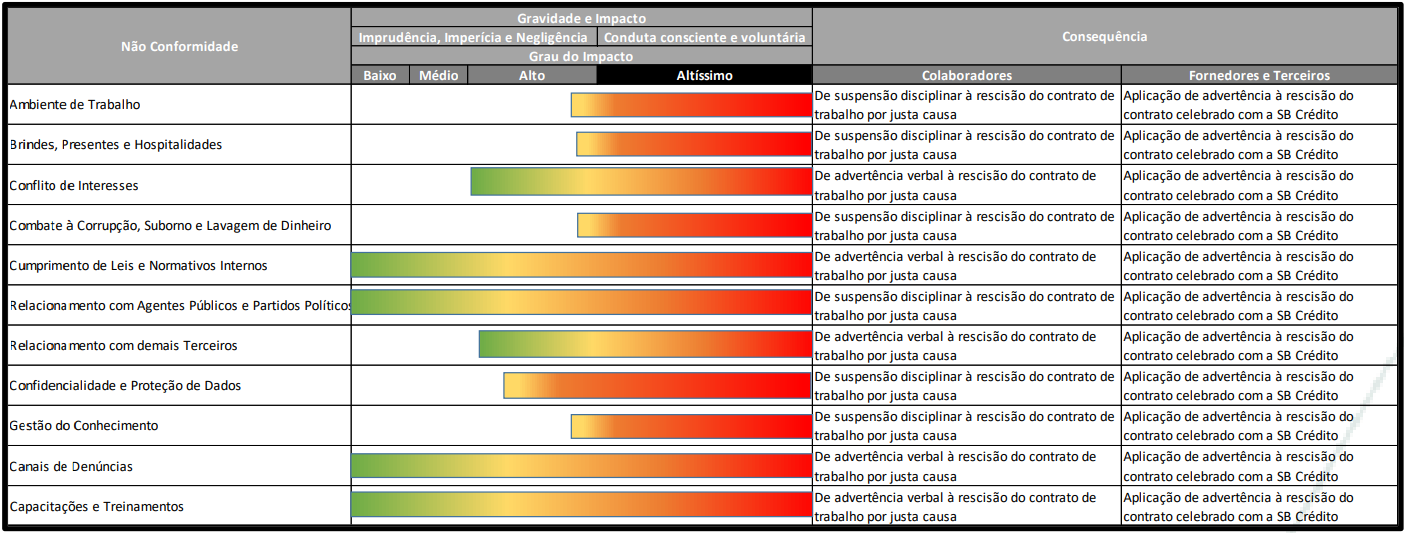 Sendo assim, os conflitos de interesses podem gerar diversas situações contrárias às disposições previstas no Código de Ética e Conduta da companhia, ainda que não proporcionem um ato efetivamente prejudicial à SB Crédito, visto que podem enfraquecer o seu desempenho e credibilidade perante o mercado.